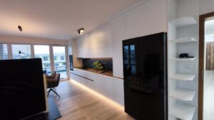 Toto řešení skvěle zapadá do moderních interiérů, kde se kombinuje kuchyňská linka, vestavěná skříň, případně šatní skříně ve stejném designu.